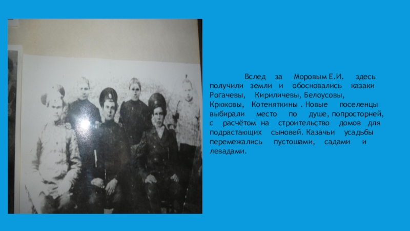 Моровым Е.И. здесь получили земли и обосновались казаки Рогачевы, Кириличевы, Белоусовы, Крюковы, Котеняткины . Новые поселенцы выбирали место по душе, попросторней, с расчётом на строительство домов для подрастающих сыновей. Казачьи усадьбы перемежались пустошами, садами и левадами.