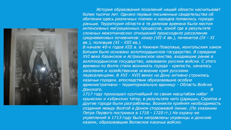 более тысячи лет. Однако первые письменные свидетельства об обитании здесь различных племен и народов появились гораздо раньше. Территория области в те далекие времена была местом интенсивных миграционных процессов, зоной где в результате сложных межэтнических отношений происходило расселение средневековых кочевников: хазар (VII-Х вв.), печенегов (IX - XI вв.), половцев (XI - XIII вв.). В начале 40-х годов XIII в. в Нижнем Поволжье, монгольским ханом Батыем было основано золотоордынское государство. В середине XVI века Казанское и Астраханское ханства, входившие ранее в золотоордынское государство, завоевали русские войска. С этого времени по Волге стали возникать города - крепости, началось заселение и хозяйственное освоение края русскими переселенцами. В XVI - XVII веках на Дону активно строились казачьи городки. впоследствии образовавшие особую административно - территориальную единицу - Область Войска Донского. В 1717 году произошел крупнейший по своим масштабам набег крымских и кубанских татар, в результате чего Царицын, Саратов и другие города были разграблены. Возникла крайняя необходимость создания между Волгой и Доном сторожевой линии. (По указанию Петра Первого построена в 1718 - 1720 гг.) На охрану ее укреплений в 1713 году были направлены украинцы и донские казаки, образовавшие Волжское казачье войско.
