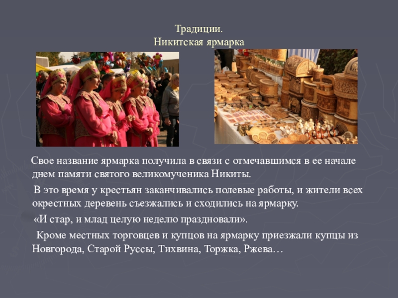 Традиции. Никитская ярмарка   Свое название ярмарка получила в связи с отмечавшимся в ее начале днем
