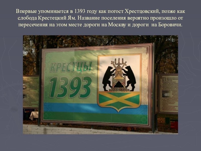 Слайд 3Впервые упоминается в 1393 году как погост Хрестцовский, позже как слобода