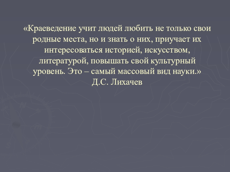 «Краеведение учит людей любить не только свои родные места, но и знать о них, приучает их интересоваться историей, искусством, литературой, повышать свой культурный уровень. Это – самый массовый вид науки.» Д.С. Лихачев