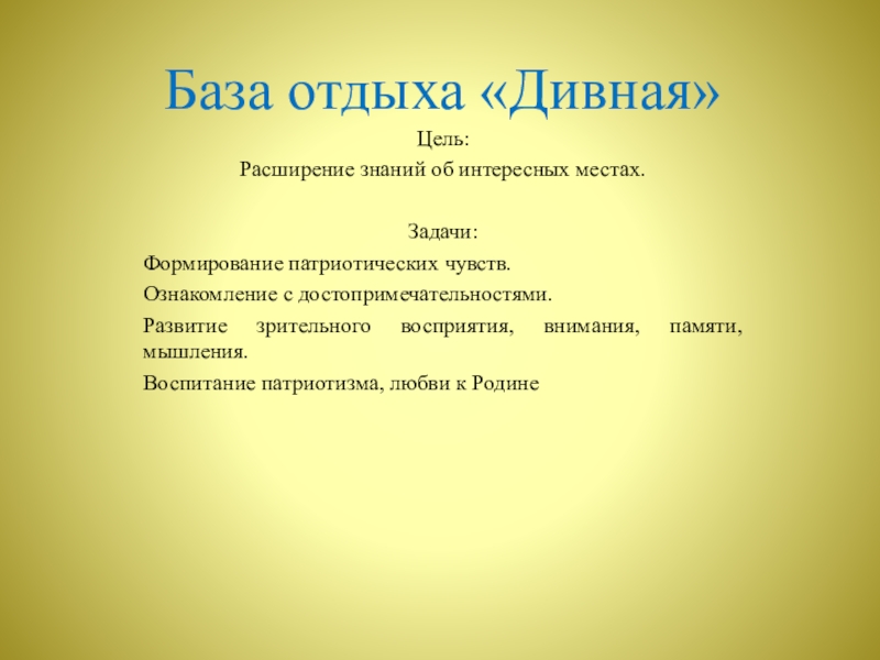 База отдыха «Дивная»Цель:Расширение знаний об интересных местах.Задачи:Формирование патриотических чувств.Ознакомление с достопримечательностями.Развитие зрительного восприятия, внимания, памяти, мышления.Воспитание патриотизма,