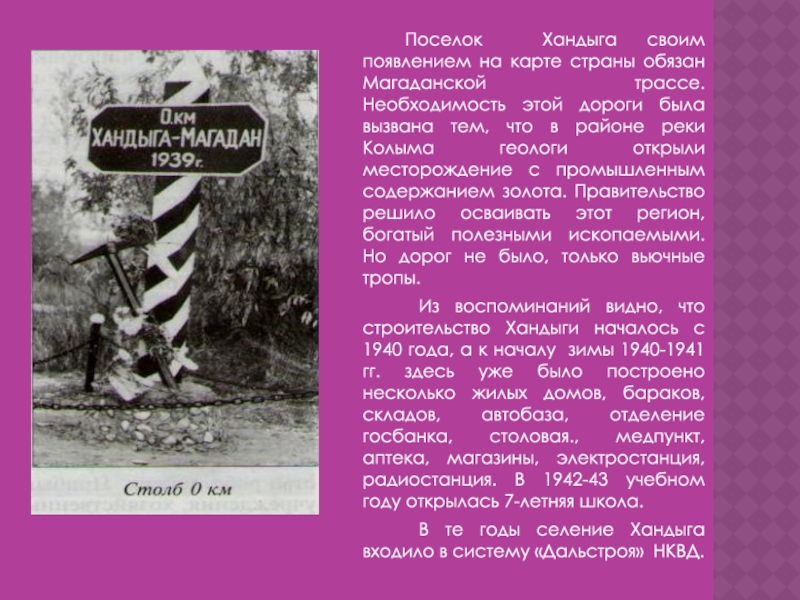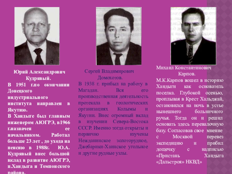 М.К.Карпов вошел в историю Хандыги как основатель поселка. Глубокой осенью, проплывая в Крест Хальджай, остановился на ночь в устье нынешнего больничного ручья. Тогда он и решил основать здесь перевалочную базу. Согласовав свое мнение с Москвой перевез экспедицию и прибил дощечку с надписью «Пристань Хандыга «Дальстроя» НКВД»