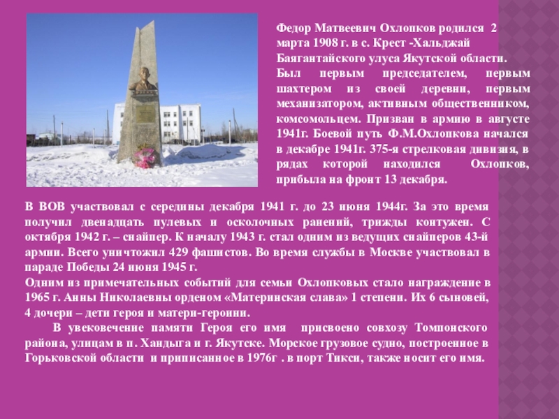Одним из примечательных событий для семьи Охлопковых стало награждение в 1965 г. Анны Николаевны орденом «Материнская слава» 1 степени. Их 6 сыновей, 4 дочери – дети героя и матери-героини.