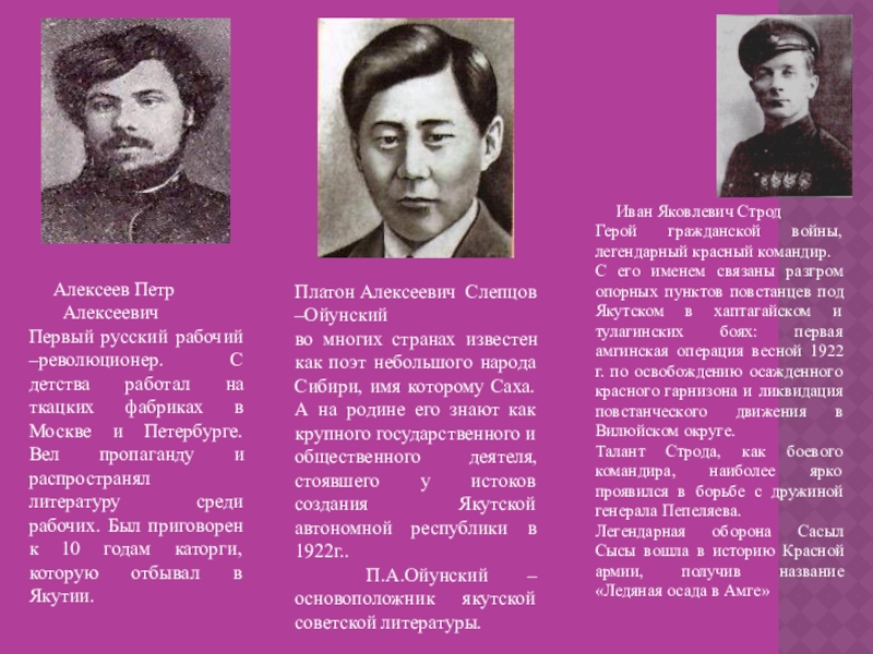 Первый русский рабочий –революционер. С детства работал на ткацких фабриках в Москве и Петербурге. Вел пропаганду и распространял литературу среди рабочих. Был приговорен к 10 годам каторги, которую отбывал в Якутии.