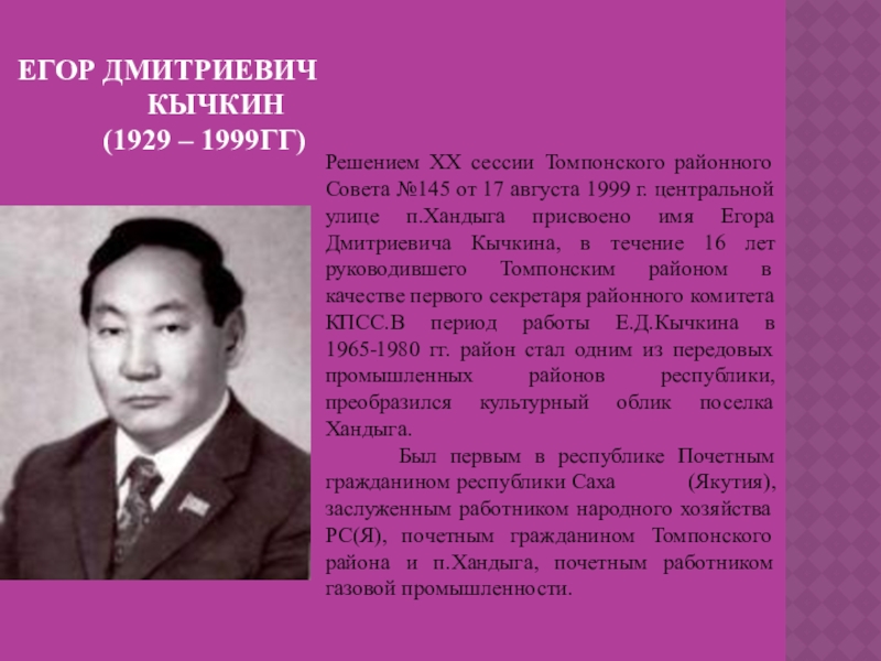 Решением XX сессии Томпонского районного Совета №145 от 17 августа 1999 г. центральной улице п.Хандыга присвоено имя Егора Дмитриевича Кычкина, в течение 16 лет руководившего Томпонским районом в качестве первого секретаря районного комитета КПСС.В период работы Е.Д.Кычкина в 1965-1980 гг. район стал одним из передовых промышленных районов республики, преобразился культурный облик поселка Хандыга.