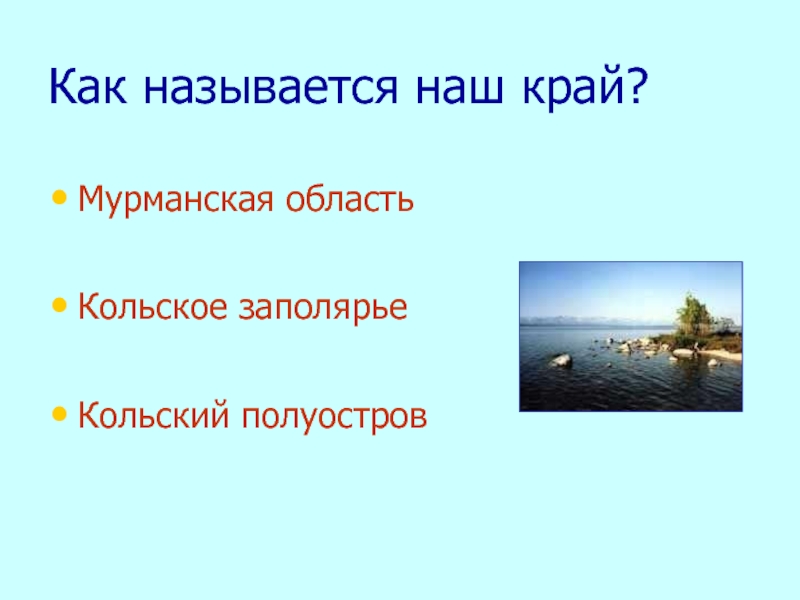 Как называется наш край?Мурманская областьКольское заполярьеКольский полуостров