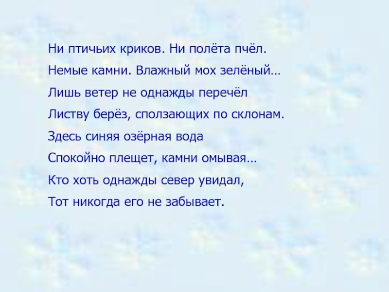 Ни птичьих криков. Ни полёта пчёл.Немые камни. Влажный мох зелёный…Лишь ветер не однажды перечёлЛиству берёз, сползающих по