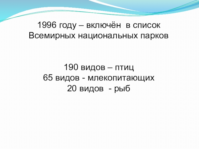 Слайд 121996 году – включён в список Всемирных национальных парков