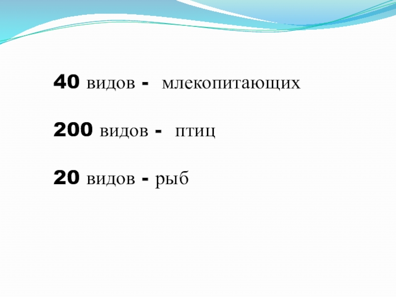 40 видов - млекопитающих200 видов - птиц20 видов - рыб