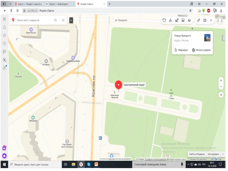 Памятник Александру Невскому был установлен в 2000 году в Первомайском парке города Курска. Автор памятника - скульптор с мировым именем, Вячеслав Михайлович Клыков, уроженец города Курска. Александр Невский - русский полководец. За всю жизнь не проиграл ни одной битвы, проявил талант полководца и дипломата. Прославился как великий полководец победами над шведами 15 июля 1240 года (Невская битва, после которой его стали называть "Невский") и над немецкими рыцарями 5 апреля 1242 года (Ледовое побоище на Чудском озере).
