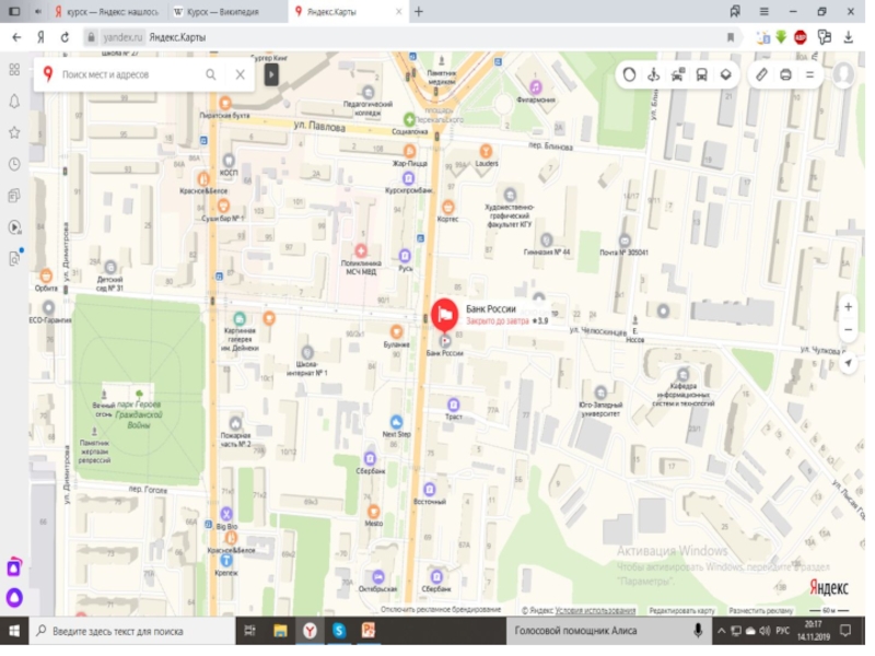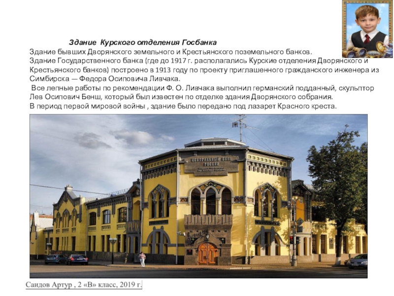 Государственного банка (где до 1917 г. располагались Курские отделения Дворянского и Крестьянского банков) построено в 1913 году по проекту приглашенного гражданского инженера из Симбирска — Федора Осиповича Ливчака.