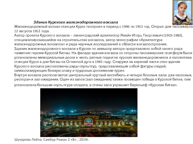 Автор проекта Курского вокзала – ленинградский архитектор Явейн Игорь Георгиевич (1903-1980), специализировавшийся на строительстве вокзалов, автор монографии «Архитектура железнодорожных вокзалов» и ряда научных исследований в области вокзалостроения.