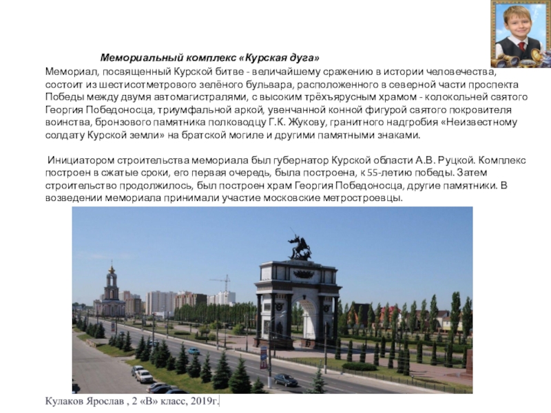 в истории человечества, состоит из шестисотметрового зелёного бульвара, расположенного в северной части проспекта Победы между двумя автомагистралями, с высоким трёхъярусным храмом - колокольней святого Георгия Победоносца, триумфальной аркой, увенчанной конной фигурой святого покровителя воинства, бронзового памятника полководцу Г.К. Жукову, гранитного надгробия «Неизвестному солдату Курской земли» на братской могиле и другими памятными знаками.