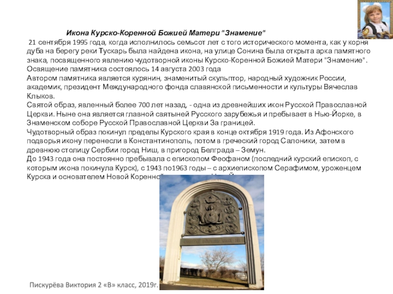 семьсот лет с того исторического момента, как у корня дуба на берегу реки Тускарь была найдена икона, на улице Сонина была открыта арка памятного знака, посвященного явлению чудотворной иконы Курско-Коренной Божией Матери "Знамение".
