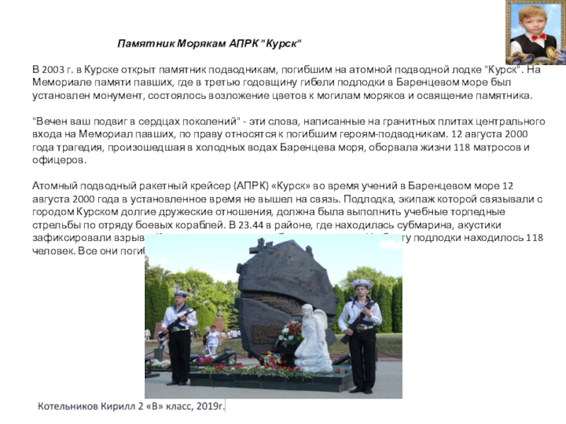 "Вечен ваш подвиг в сердцах поколений" - эти слова, написанные на гранитных плитах центрального входа на Мемориал павших, по праву относятся к погибшим героям-подводникам. 12 августа 2000 года трагедия, произошедшая в холодных водах Баренцева моря, оборвала жизни 118 матросов и офицеров.