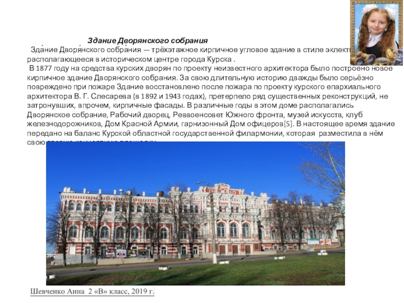Зда́ние Дворя́нского собра́ния — трёхэтажное кирпичное угловое здание в стиле эклектики, располагающееся в историческом центре города Курска .