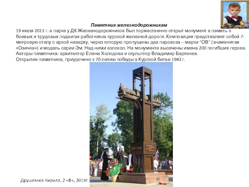 торжественно открыт монумент в память о боевых и трудовых подвигах работников курской железной дороги. Композиция представляет собой 7-метровую стелу с аркой наверху, через которую пропущены два паровоза – марки "ОВ" (знаменитая «Овечка») и модель серии Эм. Над ними колокол. На монументе высечены имена 200 погибших героев.