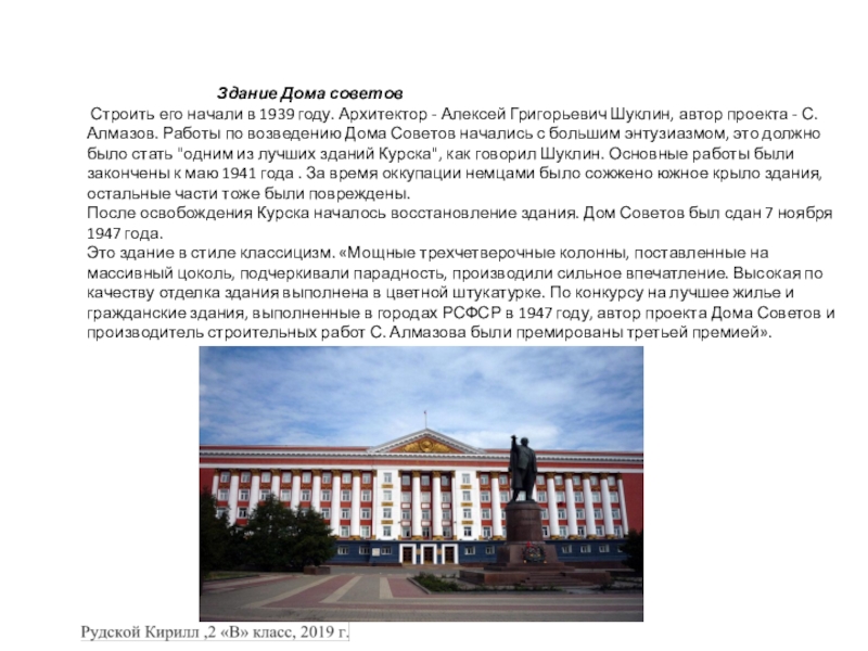 Алексей Григорьевич Шуклин, автор проекта - С. Алмазов. Работы по возведению Дома Советов начались с большим энтузиазмом, это должно было стать "одним из лучших зданий Курска", как говорил Шуклин. Основные работы были закончены к маю 1941 года . За время оккупации немцами было сожжено южное крыло здания, остальные части тоже были повреждены.