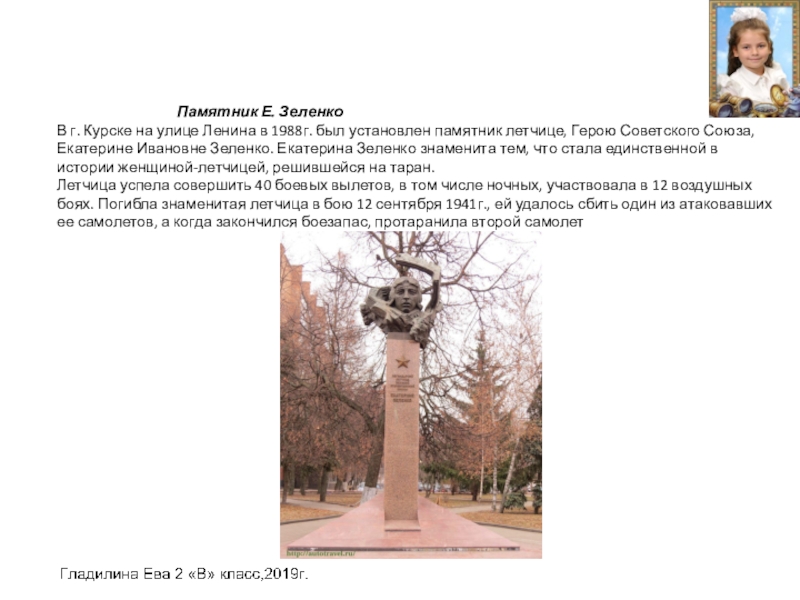 установлен памятник летчице, Герою Советского Союза, Екатерине Ивановне Зеленко. Екатерина Зеленко знаменита тем, что стала единственной в истории женщиной-летчицей, решившейся на таран.