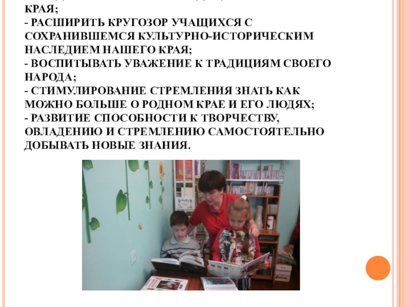 - СТИМУЛИРОВАНИЕ СТРЕМЛЕНИЯ ЗНАТЬ КАК МОЖНО БОЛЬШЕ О РОДНОМ КРАЕ И ЕГО ЛЮДЯХ;