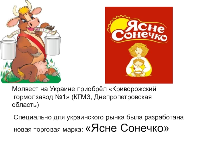Молвест на Украине приобрёл «Криворожский гормолзавод №1» (КГМЗ, Днепропетровская область)Специально для украинского рынка была разработана новая торговая марка: «Ясне Сонечко»