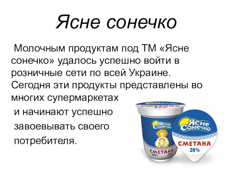 Ясне сонечко	Молочным продуктам под ТМ «Ясне сонечко» удалось успешно войти в розничные сети по всей Украине. Сегодня