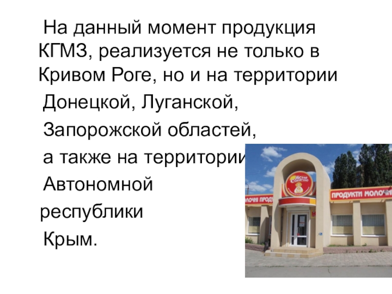 Слайд 5 На данный момент продукция КГМЗ, реализуется не только в Кривом Роге,