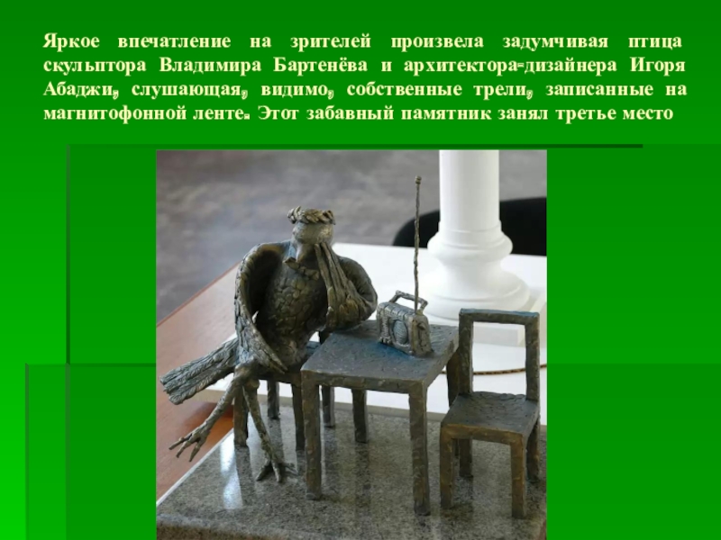 Слайд 22Яркое впечатление на зрителей произвела задумчивая птица скульптора Владимира Бартенёва и