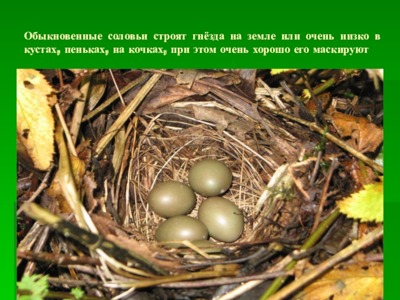 Слайд 8Обыкновенные соловьи строят гнёзда на земле или очень низко в кустах,