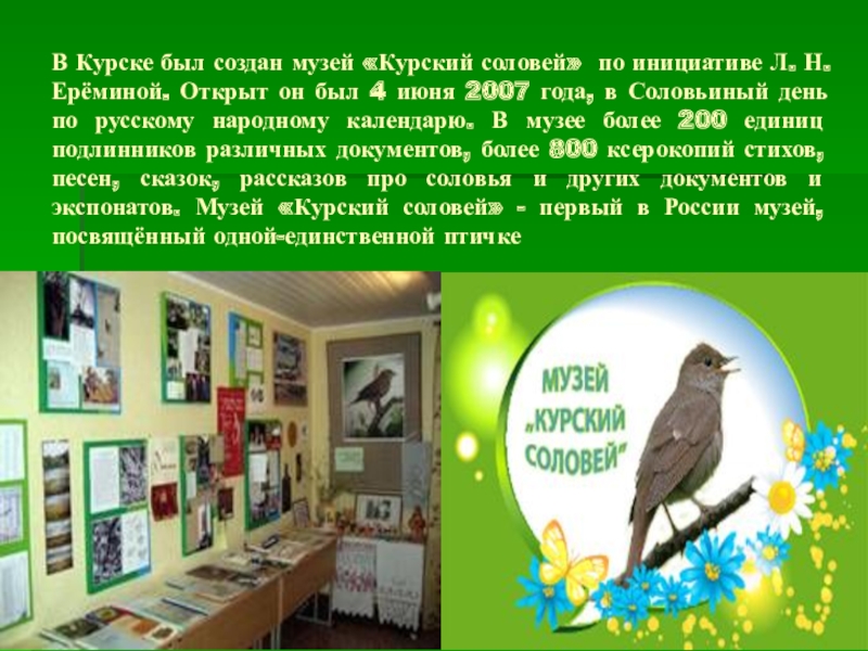 Ерёминой. Открыт он был 4 июня 2007 года, в Соловьиный день по русскому народному календарю. В музее более 200 единиц подлинников различных документов, более 800 ксерокопий стихов, песен, сказок, рассказов про соловья и других документов и экспонатов. Музей «Курский соловей» - первый в России музей, посвящённый одной-единственной птичке