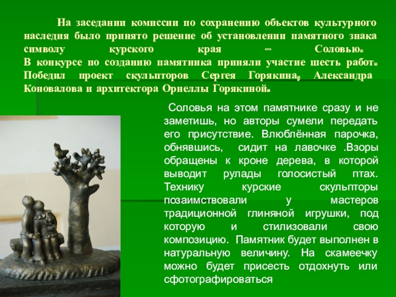 Соловья на этом памятнике сразу и не заметишь, но авторы сумели передать его присутствие. Влюблённая парочка, обнявшись, сидит на лавочке .Взоры обращены к кроне дерева, в которой выводит рулады голосистый птах. Технику курские скульпторы позаимствовали у мастеров традиционной глиняной игрушки, под которую и стилизовали свою композицию. Памятник будет выполнен в натуральную величину. На скамеечку можно будет присесть отдохнуть или сфотографироваться