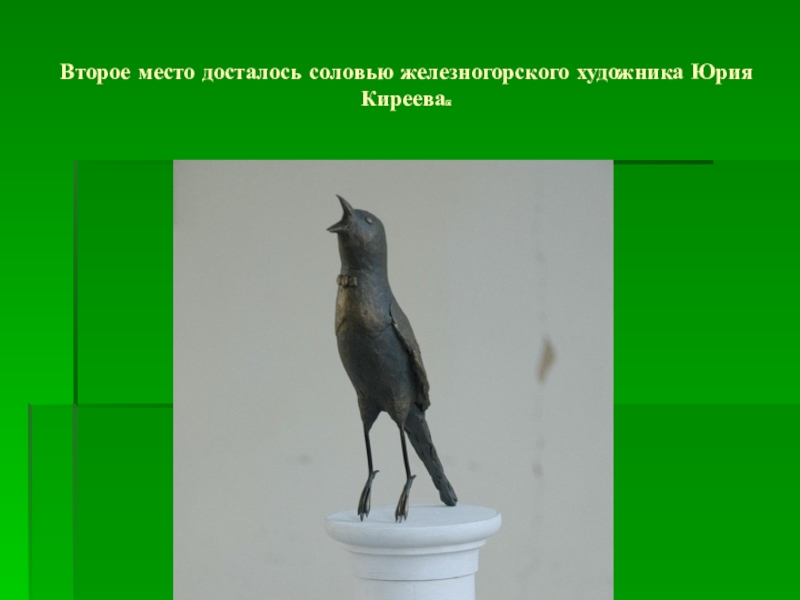 Слайд 21Второе место досталось соловью железногорского художника Юрия Киреева.