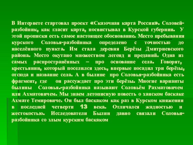 Слайд 23В Интернете стартовал проект «Сказочная карта России». Соловей-разбойник, как гласит карта,