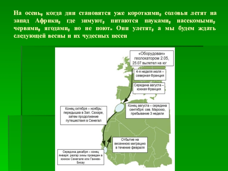 Слайд 10На осень, когда дни становятся уже короткими, соловьи летят на запад