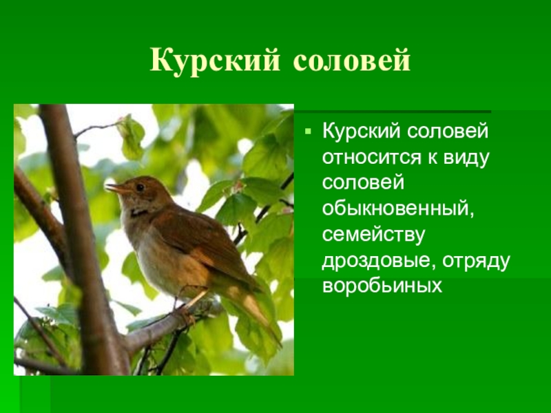 Курский соловей относится к виду соловей обыкновенный, семейству дроздовые, отряду