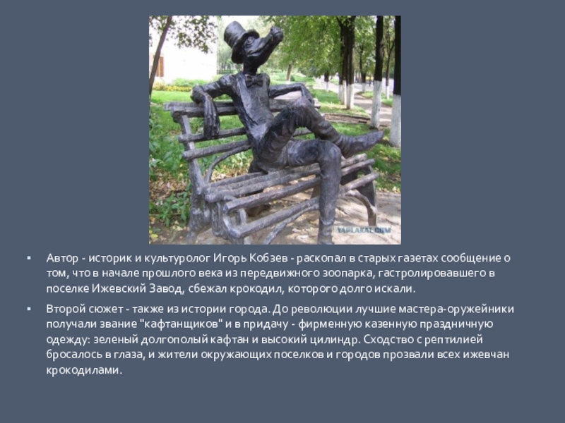 Второй сюжет - также из истории города. До революции лучшие мастера-оружейники получали звание "кафтанщиков" и в придачу - фирменную казенную праздничную одежду: зеленый долгополый кафтан и высокий цилиндр. Сходство с рептилией бросалось в глаза, и жители окружающих поселков и городов прозвали всех ижевчан крокодилами.
