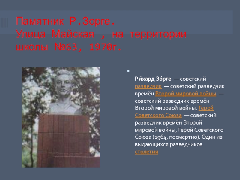 советский разведчик — советский разведчик времён Второй мировой войны — советский разведчик времён Второй мировой войны, Герой Советского Союза — советский разведчик времён Второй мировой войны, Герой Советского Союза (1964, посмертно). Один из выдающихся разведчиков столетия