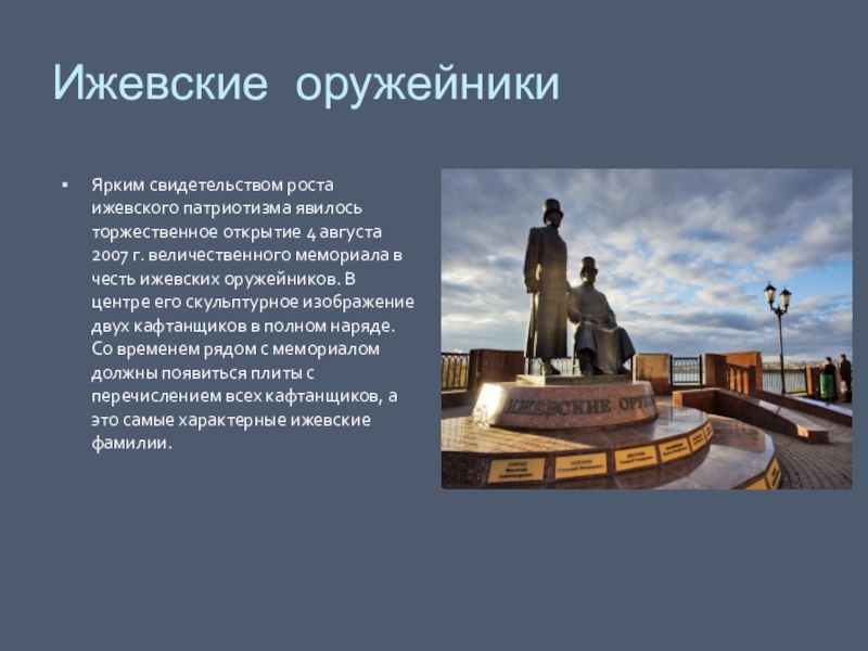 2007 г. величественного мемориала в честь ижевских оружейников. В центре его скульптурное изображение двух кафтанщиков в полном наряде. Со временем рядом с мемориалом должны появиться плиты с перечислением всех кафтанщиков, а это самые характерные ижевские фамилии.