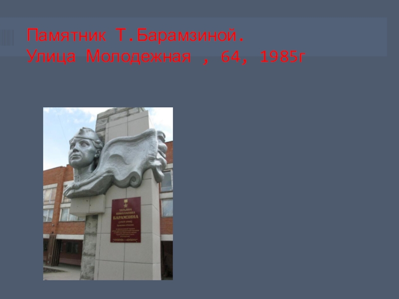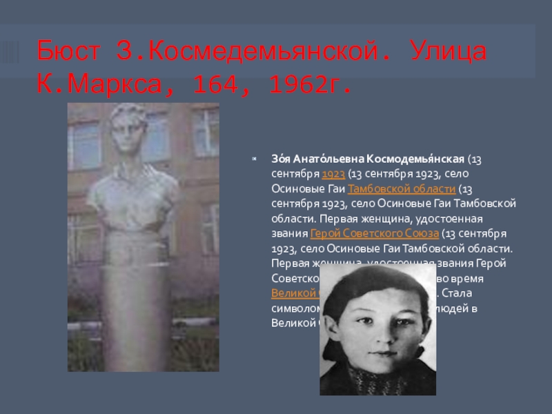 Слайд 34Бюст З.Космедемьянской. Улица К.Маркса, 164, 1962г.