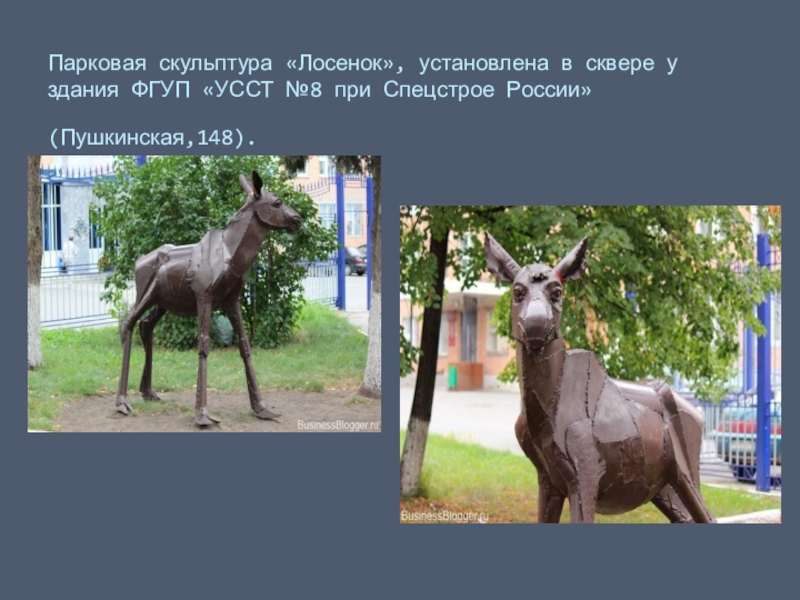 Слайд 24Парковая скульптура «Лосенок», установлена в сквере у здания ФГУП «УССТ №8