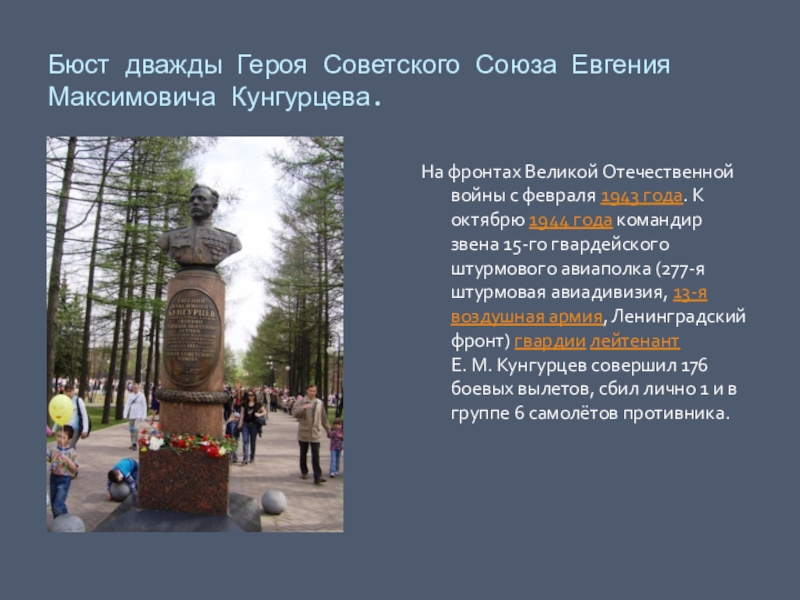 Слайд 31Бюст дважды Героя Советского Союза Евгения Максимовича Кунгурцева.