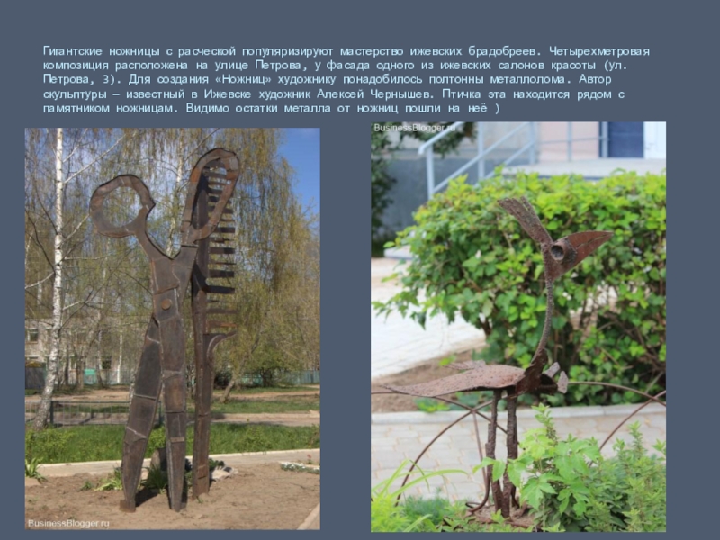 Слайд 27Гигантские ножницы с расческой популяризируют мастерство ижевских брадобреев. Четырехметровая композиция расположена