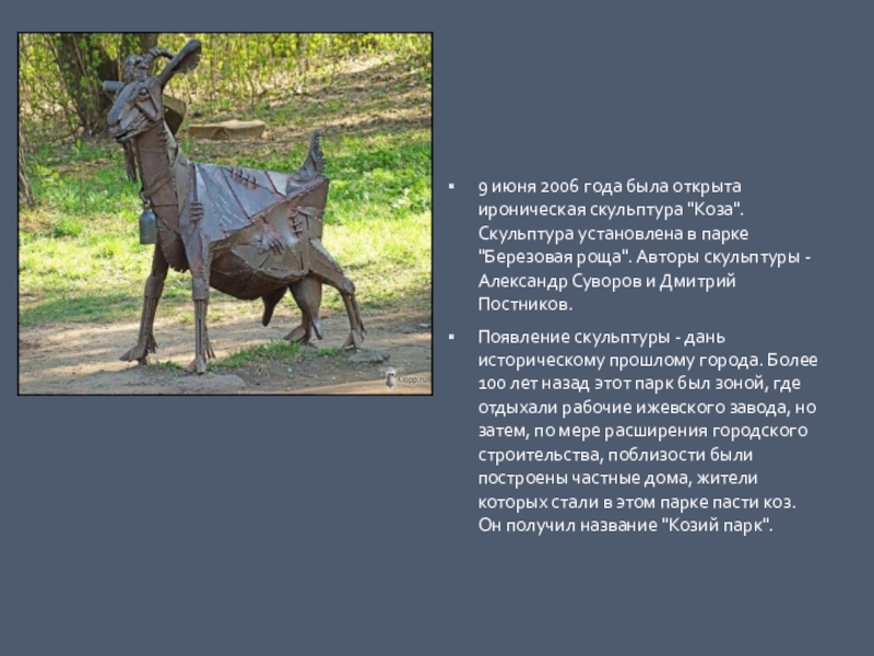 Появление скульптуры - дань историческому прошлому города. Более 100 лет назад этот парк был зоной, где отдыхали рабочие ижевского завода, но затем, по мере расширения городского строительства, поблизости были построены частные дома, жители которых стали в этом парке пасти коз. Он получил название "Козий парк".