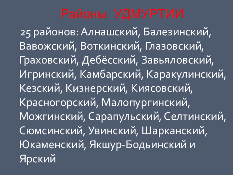 25 районов: Алнашский, Балезинский, Вавожский, Воткинский, Глазовский, Граховский, Дебёсский,