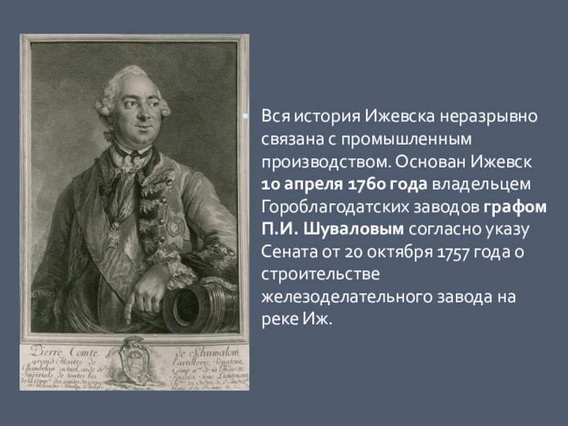 апреля 1760 года владельцем Гороблагодатских заводов графом П.И. Шуваловым согласно указу Сената от 20 октября 1757 года о строительстве железоделательного завода на реке Иж.