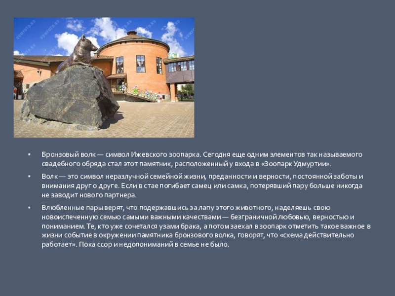 свадебного обряда стал этот памятник, расположенный у входа в «Зоопарк Удмуртии».