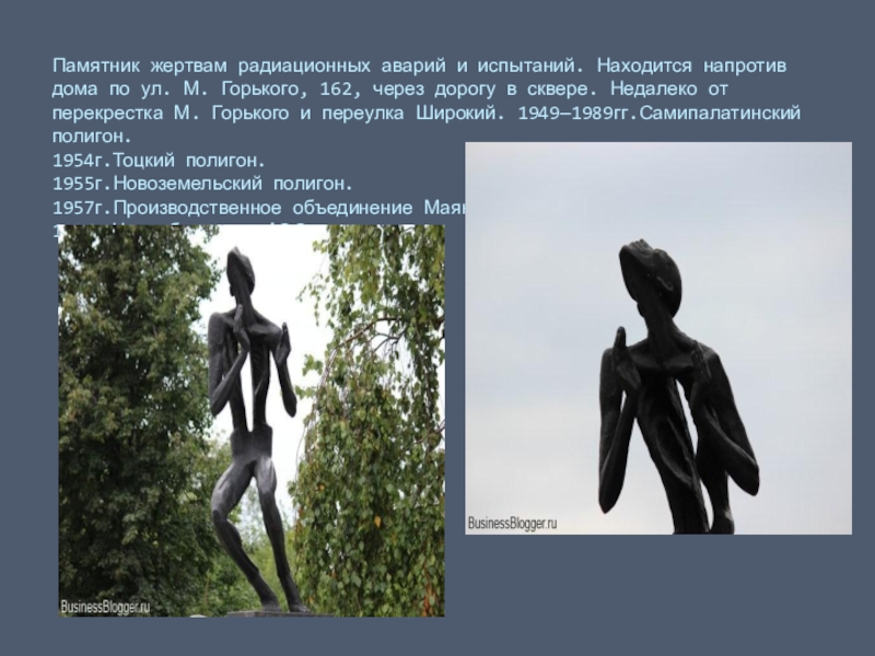 Слайд 28Памятник жертвам радиационных аварий и испытаний. Находится напротив дома по ул.