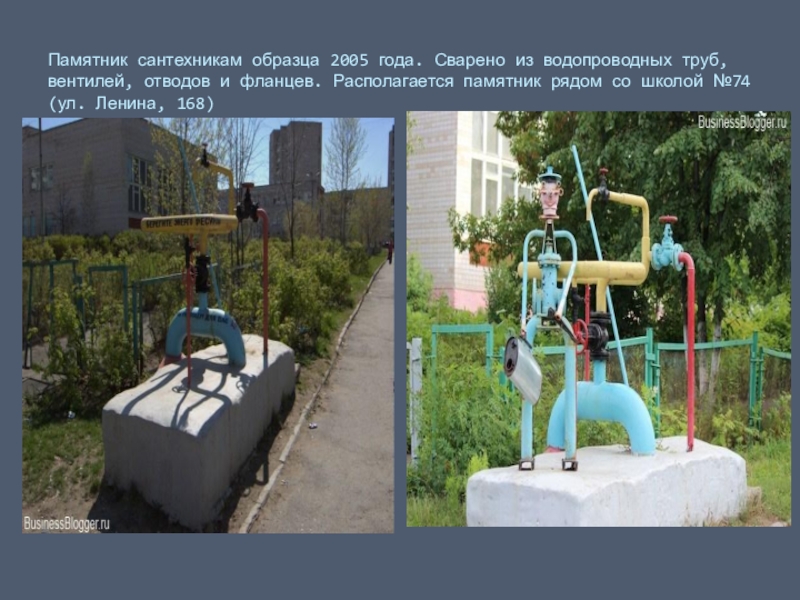 Слайд 26Памятник сантехникам образца 2005 года. Сварено из водопроводных труб, вентилей, отводов