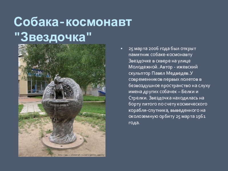 сквере на улице Молодежной. Автор - ижевский скульптор Павел Медведев.У современников первых полетов в безвоздушное пространство на слуху имена других собачек – Белки и Стрелки. Звездочка находилась на борту пятого по счету космического корабля-спутника, выведенного на околоземную орбиту 25 марта 1961 года.